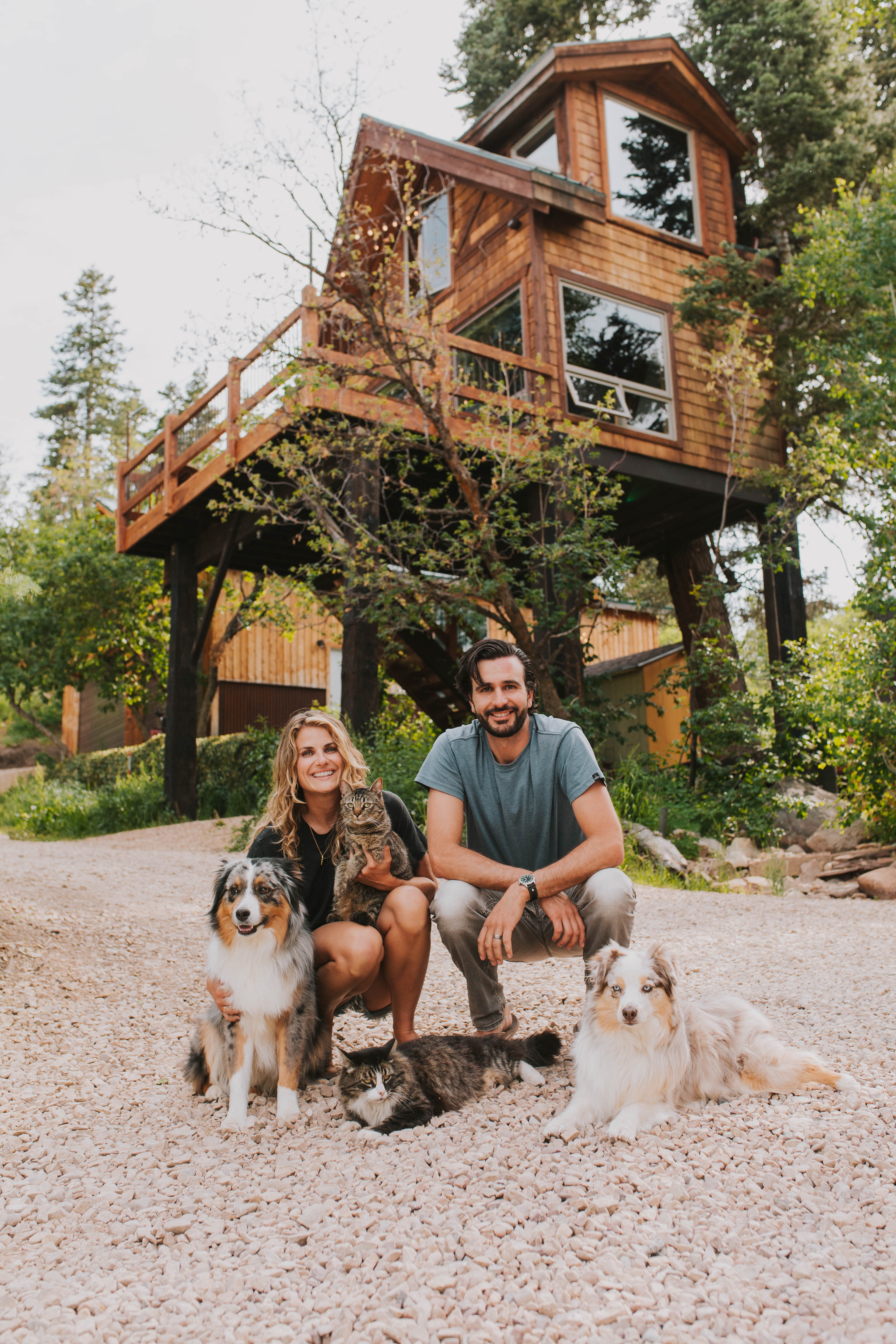 Left Picture: Rocky (Left) & Gianni (Right) with their chalet security team in front of The Treehouse Utah; their two Mini Aussies, Archer & Nikita, and two curious kitties who often greet guests, Katze & Barry.