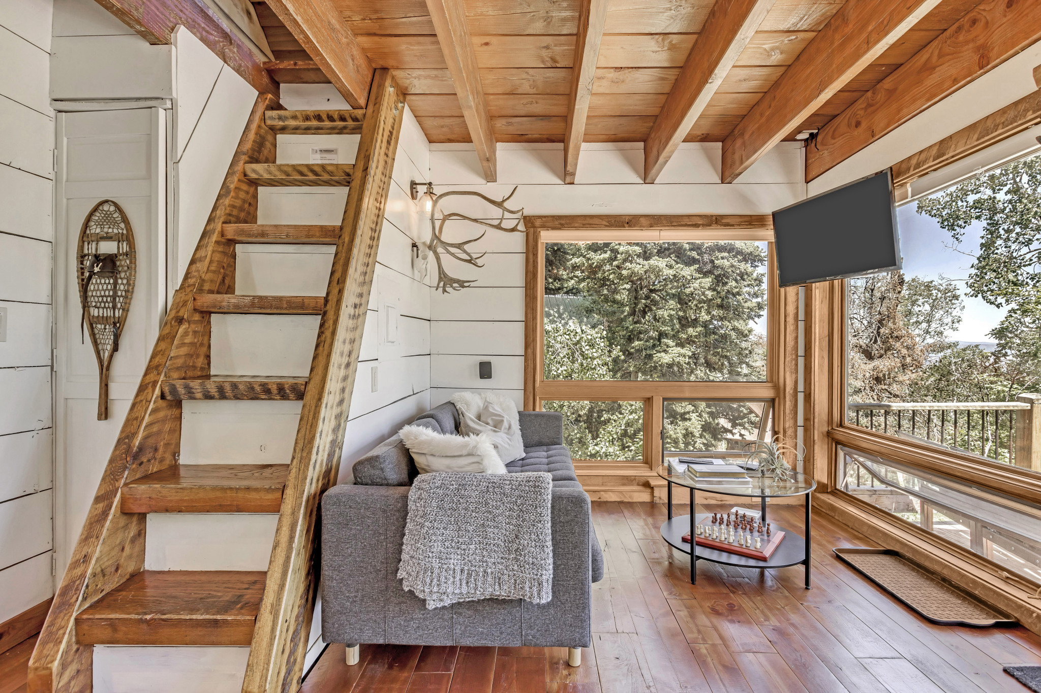 Our gorgeous lofted bedroom with skylight, 180-degree windows with views of the Uinta mountains, and cozy hidden location make us one of Park City’s most unique and comfortable accommodations. We are less than a 20 minute drive to Park City, Utah where you can find some of the best skiing in the world.